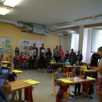 Dnes je velký den pro 51 prvňáčků. Na nádvoří je přivítal pan ředitel, paní zástupkyně, zástupce města a samozřejmě také paní učitelky, které už se na děti moc těšily.