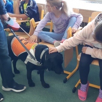 Pan Holba nám vysvětlil, co znamená červenobílá hůl, kterou běžně používá a jakou nevyčíslitelnou hodnotu má pro nevidomé lidi dobře vycvičený vodící pes. Díky nim se takto postižení lidé stávají samostatnými a nezávislými. Výcvik slepeckých psů je velmi finančně náročný. I my můžeme přispět- a to zakoupením krásných, plyšových, pohankových zvířátek.