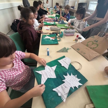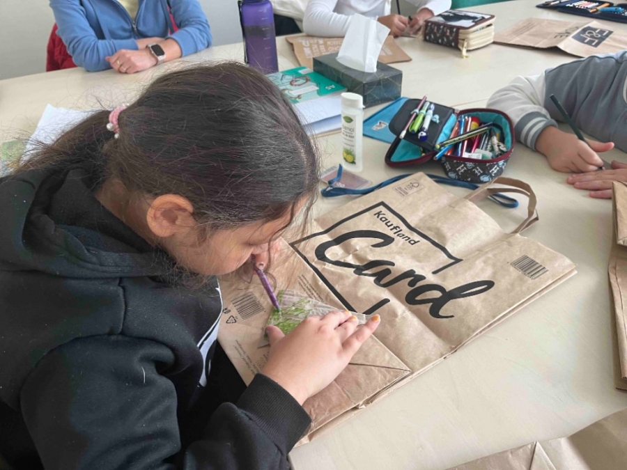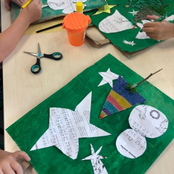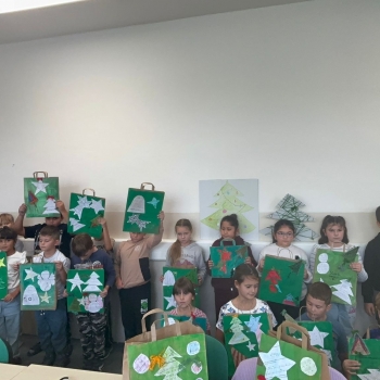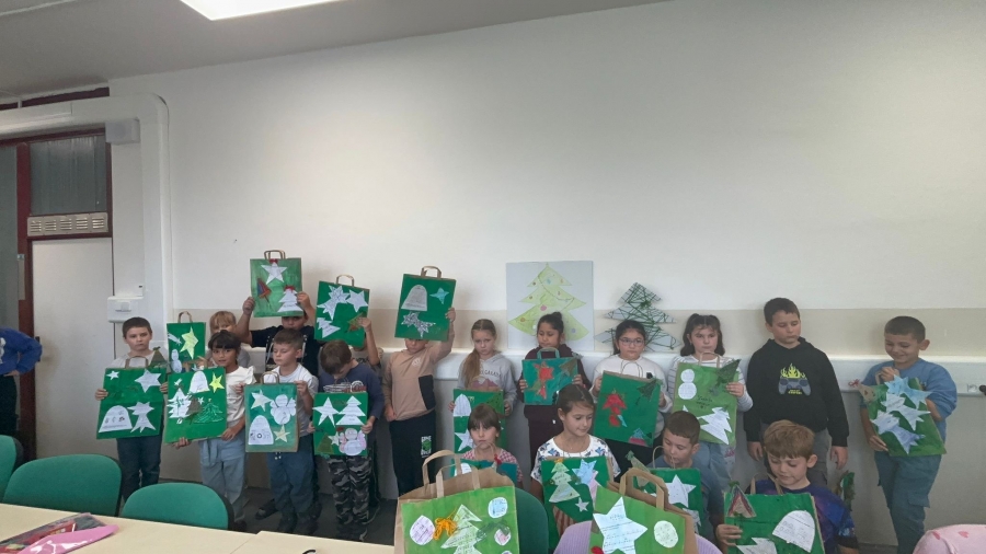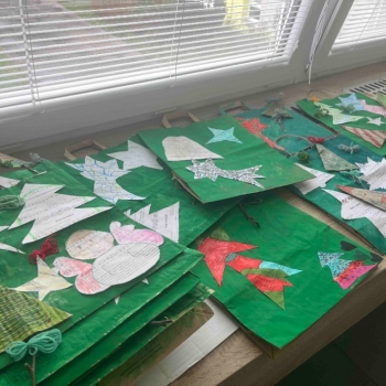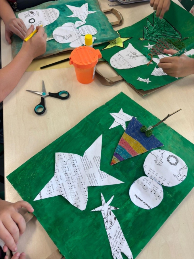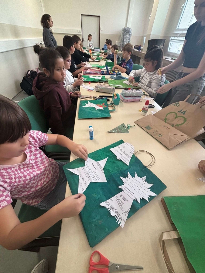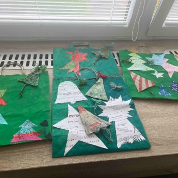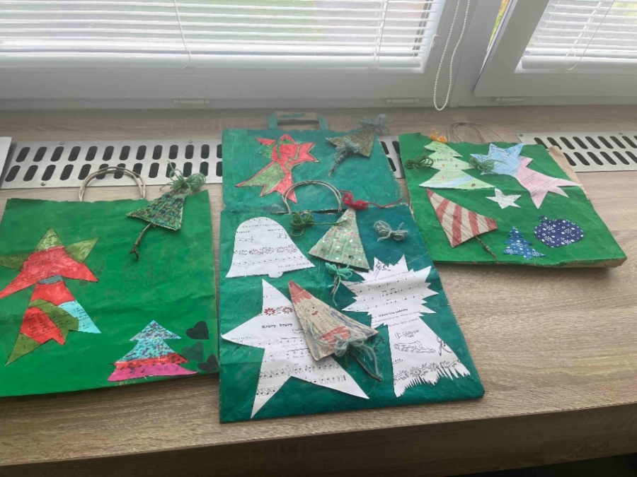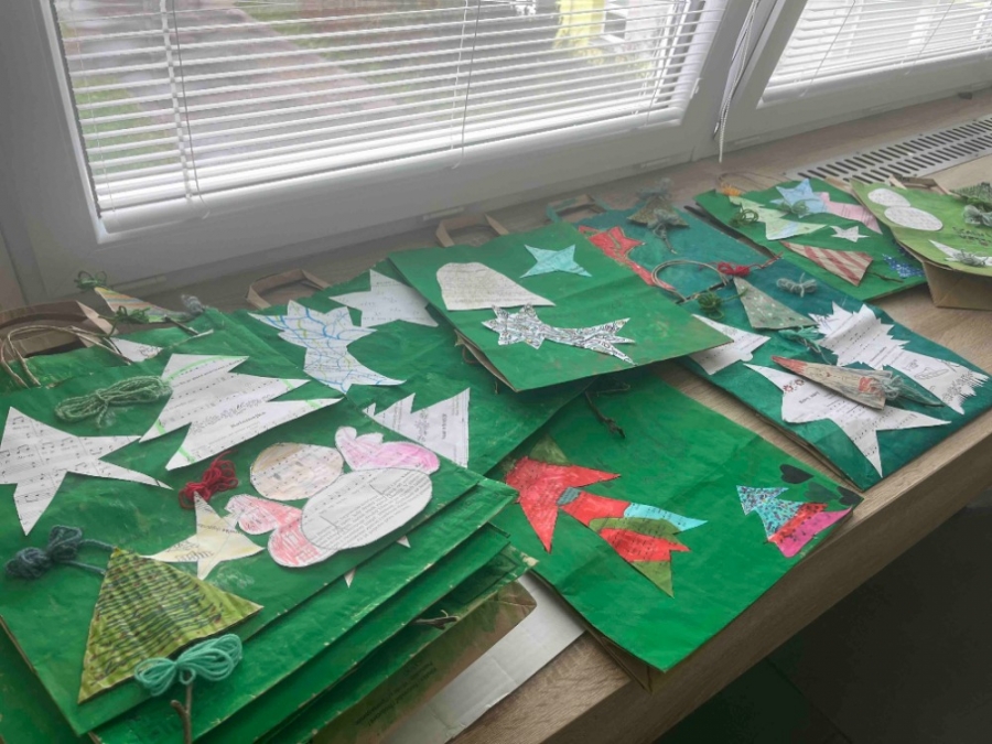 Naším návrhem bylo využít staré papírové tašky a vyřazené učebnice ve prospěch ekologické i kreativní tvorby. Děti každou tašku natřely zelenou barvou, ozdobily ji vánočními motivy vystřiženými z učebnic hudební výchovy a při práci si společně zazpívaly koledy. Hudba se tak stala nejen inspirací, ale i součástí celého procesu tvorby.