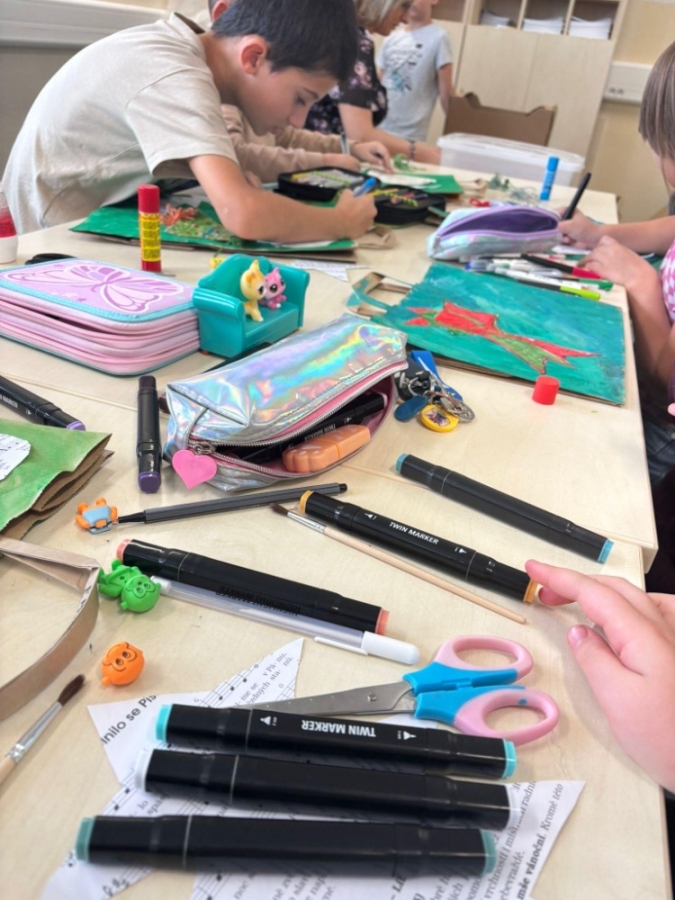 Ke každé tašce navrhly originální jmenovku ve tvaru stromečku z kartonu, doplněnou o kmen z nasbíraného dřívka. Projekt tak propojuje recyklaci materiálu, hudební aktivitu, kreativní myšlení i týmovou spolupráci.