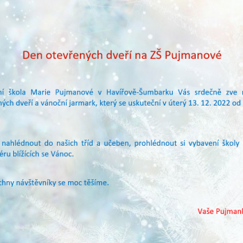 Základní škola Marie Pujmanové v Havířově-Šumbarku Vás srdečně zve na Den otevřených dveří a vánoční jarmark, který se uskuteční v úterý 13. 12. 2022 od 7:00 do 17:00.